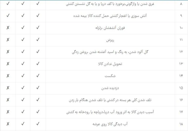شامل خسارتهای ناشی از آتشسوزی، سرقت، غرقشدن کشتی، تصادف، شکستگی و حتی حوادث غیرمترقبه است.