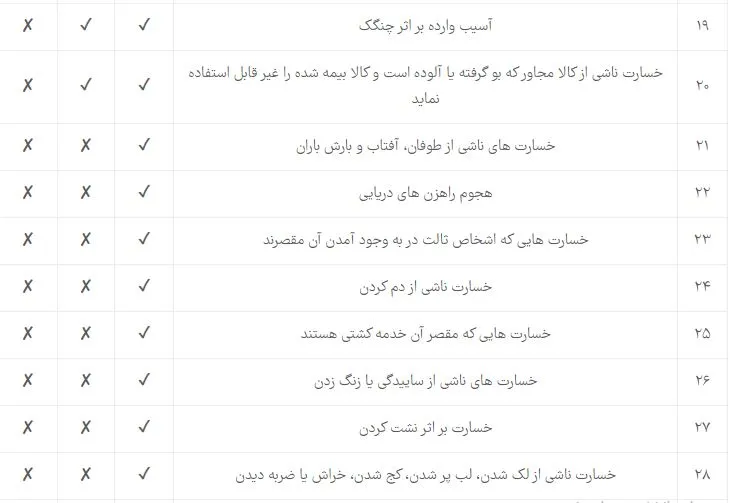 تقریباً تمام خسارتهای احتمالی از جمله آسیب جزئی، سرقت، حوادث حین بارگیری و تخلیه را شامل میشود.